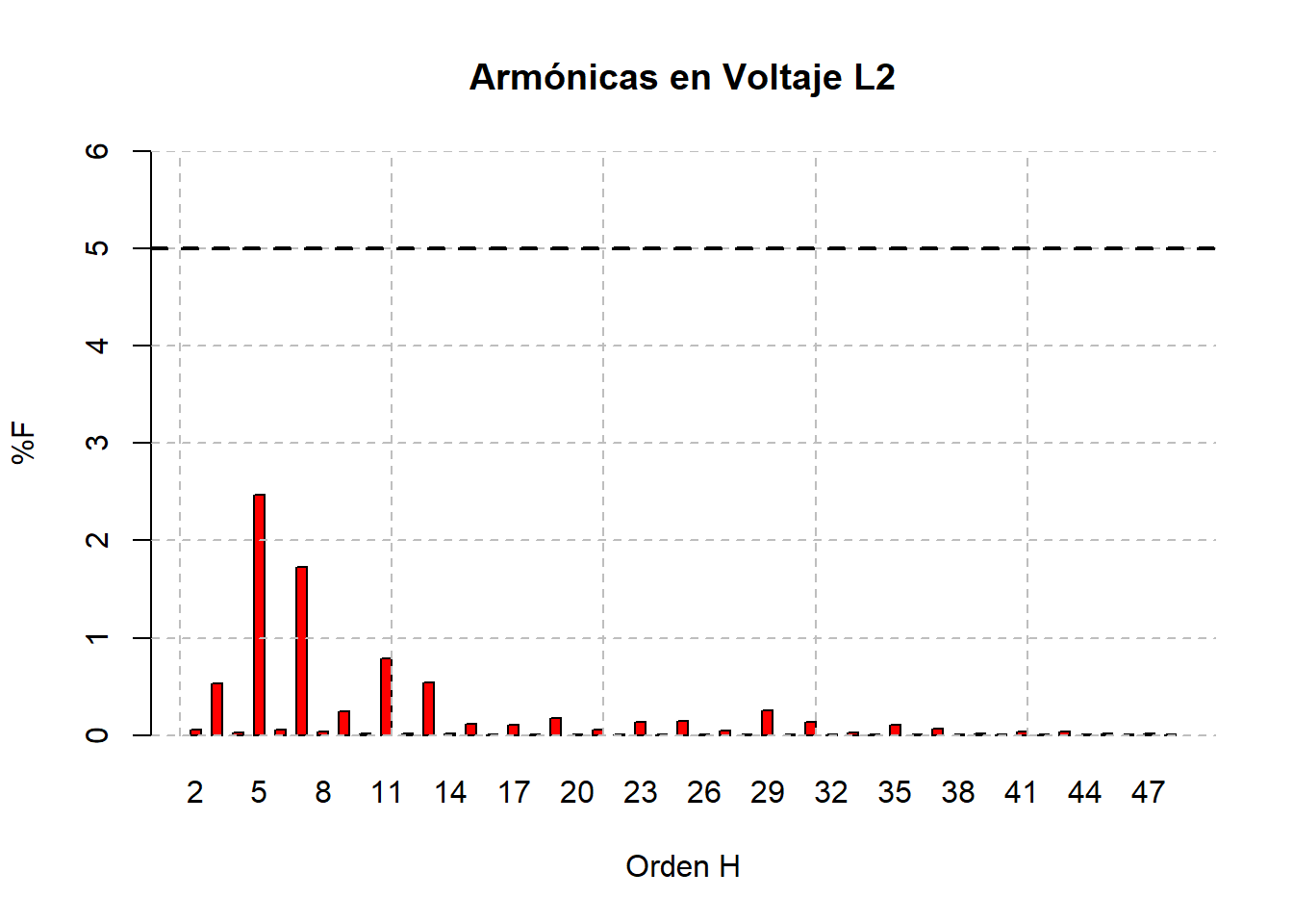 El comportamiento de las armónicas de la corriente sigue un comportamiento normal, donde la armónica 5ª es la de mayor magnitud, y se mantiene por arriba del 15% de la fundamental, y la 7ª por debajo del 5%, por lo que la diferencia entre ambas es grande, se debe de revisar que la armónica 5ª no esté ocasionando problemas en la red. Por otro lado, las armónicas de la tensión siguen un comportamiento similar pero dentro de los límites recomendados.